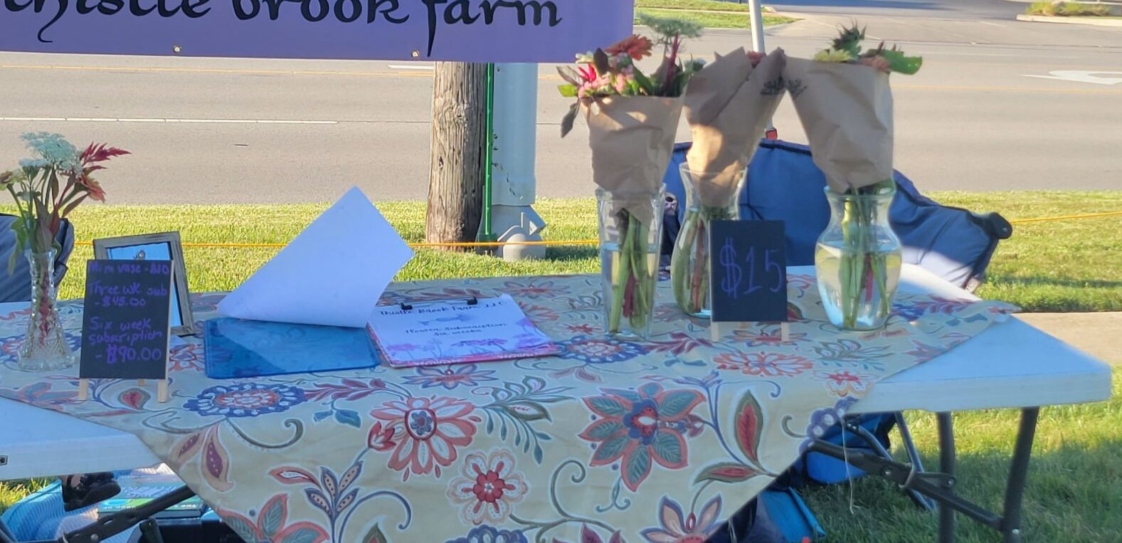 Now, I was going to barely make it to market before it opened. We hauled everything over to our spot and rapidly got the booth set up with the flower’s displayed. I was able to stop and take a quick breather and set up a little play/rest area for my kids to sit at while we worked the booth.